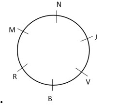 Six Girls are sitting on a round table with face towards the center. B is the immediate left side of V. R is in between B and M. N is in between M and J. Who is in the immediate left of M?