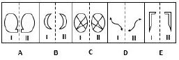 In four out of the given five pairs of figures below, which are named as A, B, C, D & E, The figure I and figure II are related in a particular way. Spot out the pair in which this relationship doesn't exist between figure I and figure II? |