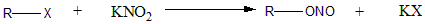 The substitution product formed when KNO2 reacts with an alkyl group is alkyl nitrite. The reaction is as follows: Where R is an alkyl group, X is a halogen atom, and KX is the potassium salt of the halogen atom. The reaction proceeds through a nucleophilic substitution mechanism. The negatively charged oxygen atom of KNO2 attacks the alkyl halide, displacing the halogen atom. The resulting alkyl nitrite is a relatively unstable compound that can decompose to form nitrous oxide and the alkyl halide.