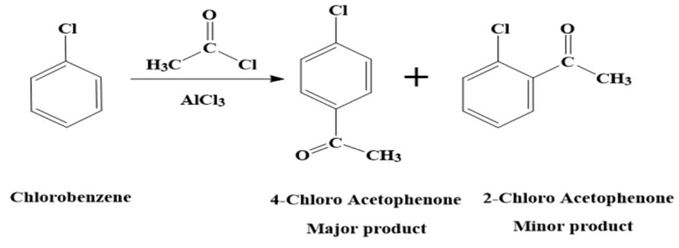 Because of steric hindrance, the para product is formed in greater amount than ortho. What gets attached? An acetyl group $(-\text{COCH}_3)$ substitutes on the ring at ortho and para positions, with para predominating. Major product = p-Chloroacetophenone Option Analysis