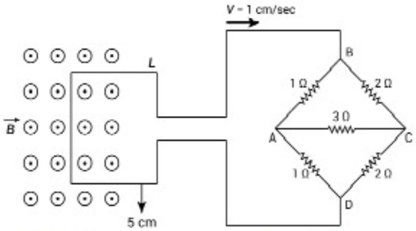 $\text{The given network of resistor is a balanced wheatstone bridge is } R_{eq} = \frac{2\times4}{2+4} = \frac{4}{3}\Omega=1.3 \Omega$ $\text{Net Resistance is } R = 1.7+ 1.3 = 3.0\Omega$ $\text{ EMF Induced is }\xi = Blv = 1\times 0.05\times 0.01 = 5\times 10^{-4} V$ $I = \frac{\xi}{R} = \frac{5\times 10^{-4}}{3} = 170 \mu A$ |