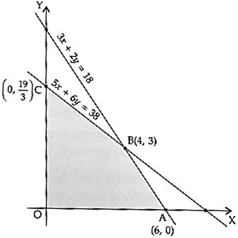 The correct answer is Option (1) → 4 machines of type A and 3 machines of type B Let x and y be the number of machines of type A and type B respectively which the mill owner should buy, then the daily production $P = 50x + 40y$ (units). Hence, the problem can be formulated as an L.P.P. as follows: Maximize $P = 50x + 40y$ subject to the constraints $1000x + 1200y ≤ 7600$ i.e. $5x + 6y ≤ 38$ (area constraint) $12x+8y≤72$ i.e. $3x + 2y ≤ 18$ (labour constraint) $x ≥0, y ≥ 0$ (number of machines cannot be negative). We draw the graphs of the straight lines $5x+6y= 38, 3x + 2y = 18$ and shade the region satisfied by the above inequalities. The shaded portion represents the feasible region, which is bounded. The corner points of the feasible region are $O(0, 0), A(6, 0), B(4, 3)$ and $C(0, \frac{19}{3})$. At $O(0, 0), P = 50 × 0 + 40 × 0 = 0,$ at $A(6, 0), P = 50 × 6 + 40 × 0 = 300,$ at $B(4, 3), P = 50 × 4 + 40 × 3 = 320$ and at $C(0, \frac{19}{3}), P = 50.0 + 40 ×\frac{19}{3}=\frac{760}{3}=253\frac{1}{3}$ We find that maximum P(production) is 320 units at B(4, 3). Hence, the mill owner should buy 4 machines of type A and 3 machines of type B. |