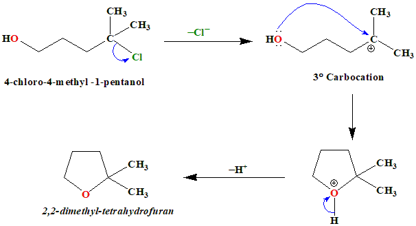 When 4-chloro-4-methyl -1-pentanol is present in a neutral polar solution, the chloro group \((-Cl)\) can leave easily as it is a good leaving group creating a stable tertiary carbocation, then the lone pair of the \(-OH\) group interacts with the carbon carrying the positive charge leading to cyclization followed by the release of a proton to form 2,2-Dimethyltetrahydrofuran. The reaction will be as follows: