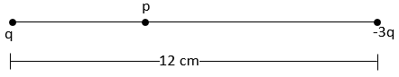 The correct answer is Option (3) → 3 cm The electric potential at a point, $v=\frac{kq}{r}$ Total potential at point P, $v_p=\frac{kq}{x}+\frac{k(-3q)}{12-x}=0$ $⇒\frac{kq}{x}=\frac{k3q}{12-x}$ $⇒\frac{1}{x}=\frac{3}{12-x}$ $⇒x=3cm$ |