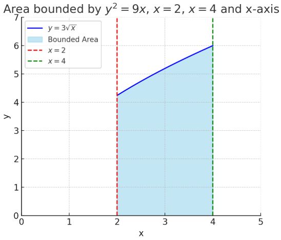 The correct answer is Option (4) → $16 - 4\sqrt{2}$ sq. units Region: \(y^2=9x\Rightarrow y=3\sqrt{x}\) (first quadrant). Area = \(\int_{2}^{4}3\sqrt{x}\,dx\). \(\displaystyle \int_{2}^{4}3\sqrt{x}\,dx=3\int_{2}^{4}x^{1/2}\,dx=3\left[\frac{2}{3}x^{3/2}\right]_{2}^{4}=2\left(4^{3/2}-2^{3/2}\right)\) \(\displaystyle =2\left(8-2^{3/2}\right)=16-2^{5/2}=16-4\sqrt{2}\) |
