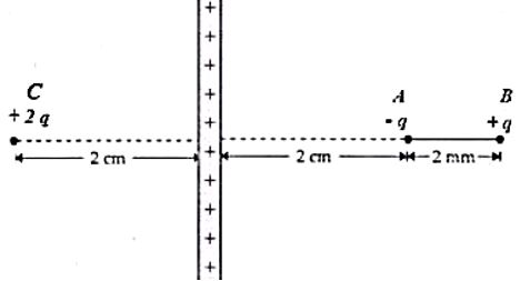 An electric dipole consists of charges $± 2 × 10^{-8} C$, separated by a distance of 2 mm. It is placed on the right side near a long line charge of density $4 × 10^{-4} C m^{-1}$. The negative charge of dipole is at a distance of 2 cm from the line charge as shown in figure. A positive charge (+2q) is placed on the left at 2 cm at point C. Given $q = 2 × 10^{-8} C$ (A) Force $|F_A|$ exerted on negative charge at point A due to line charge Choose the correct answer from the options given below: |