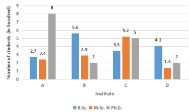 The following graph shows the number of students (in hundreds) in three different courses in four different institutes. Study the graph and answer the question. What is the total number of students (in hundreds) in M.Sc course across all institutes? |
