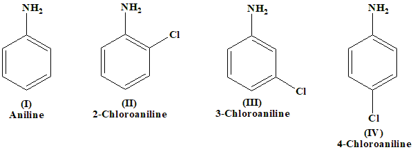 Let us break down the reasoning for arranging the amines in decreasing order of basic strength based on their structures and the effects of substituents: Aniline (I): Aniline is a benzene ring with an amino group (-NH₂) attached to it. It is a moderately basic compound due to the lone pair of electrons on the nitrogen atom, which can readily accept a proton (H⁺). Aniline itself has no substituents that withdraw electron density from the amino group, so it is the most basic among the given compounds. 4-Chloroaniline (IV): In 4-chloroaniline, the chlorine atom is attached to the benzene ring in the para position relative to the amino group. Chlorine is an electron-withdrawing group due to its strong inductive effect, which pulls electron density away from the amino group through the benzene ring. This reduces the availability of the lone pair of electrons on the nitrogen for protonation, making 4-chloroaniline less basic than aniline. 3-Chloroaniline (III): In 3-chloroaniline, the chlorine atom is attached to the benzene ring in the meta position relative to the amino group. The meta position is less electron-withdrawing compared to the para position. Therefore, 3-chloroaniline is more basic than 4-chloroaniline but less basic than aniline and 2-chloroaniline. 2-Chloroaniline (II): In 2-chloroaniline, the chlorine atom is attached to the benzene ring in the ortho position relative to the amino group. Ortho-substituted chloro groups can exert a significant steric hindrance effect due to close proximity to the amino group, which can reduce the basicity compared to meta-substituted compounds like 3-chloroaniline. Additionally, the ortho position's electron-withdrawing effect is stronger than the meta position but less than the para position. Thus, 2-chloroaniline is the least basic among the given compounds due to both steric and electronic effects. Therefore, the correct decreasing order of basic strength among the compounds is: This order reflects the combined effects of electronic withdrawal through chlorine substitution and potential steric hindrance on the basicity of the amino group in these substituted anilines. |