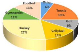 The pie-chart below gives the spending of a country on various sports during a particular year as percentages of total spending of all sports by the country in that year. Based on the information given in the pie-chart, find the total amount spent (in crores of rupees) by the country on volleyball and gymnastic taken together in that year, if the total spending by the country in that year on all sports taken together was ₹286 crores. |