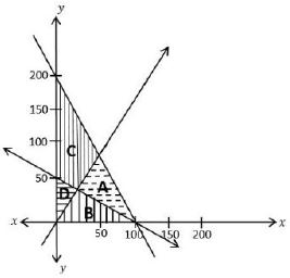 The correct answer is Option (2) → Region C The given constraints are: $x + 2y \geq 100$ (above the line) $2x - y \leq 0 \Rightarrow y \geq 2x$ (above the line) $2x + y \leq 200$ (below the line) $x \geq 0$, $y \geq 0$ (first quadrant) To satisfy all these constraints simultaneously, we look for the region that: