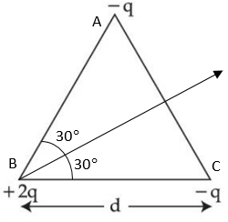 Three charges are arranged on the vertices of an equilateral triangle. Find the dipole moment of the combination. |