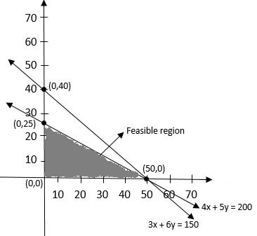 ∴ Optimal production → 50 basic chair only and 0 luxury chair. $Z_{max}=Z(50,0)$ Maximize Z=300x+200y Z=300×50+200×0 $=15,000$ |