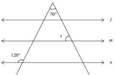 The correct answer is Option 1: 80° Given: l ∥m ∥ n Two slanted lines form a triangle with the top angle 70°. Step 1: Use the angle at line n The angle shown is 120° with the left transversal. So the interior angle with the triangle is: 180°−120°=60° This becomes the left base angle of the triangle (by alternate interior angles since lines are parallel). Step 2: Sum of angles in a triangle Let the right base angle = y 70°+60°+y=180° Step 3: Angle x Angle x lies on line m and forms a linear pair with the interior angle 50° x=180°−50°=130° But the marked angle in the figure is the supplementary interior angle between the transversal and the parallel line, giving the acute angle corresponding to the triangle side: x=80° |