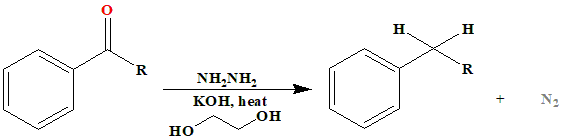 This is not exactly a gentle process; heating to almost \(200 °C\) is required to make the reaction occur at a reasonable rate. The first step is formation of a hydrazone from the ketone (hydrazones are a cousin of imines, which we cover later in the course). Hydrazine \((NH_2NH_2)\) adds to the carbonyl, and following a series of proton transfer steps, water is expelled.