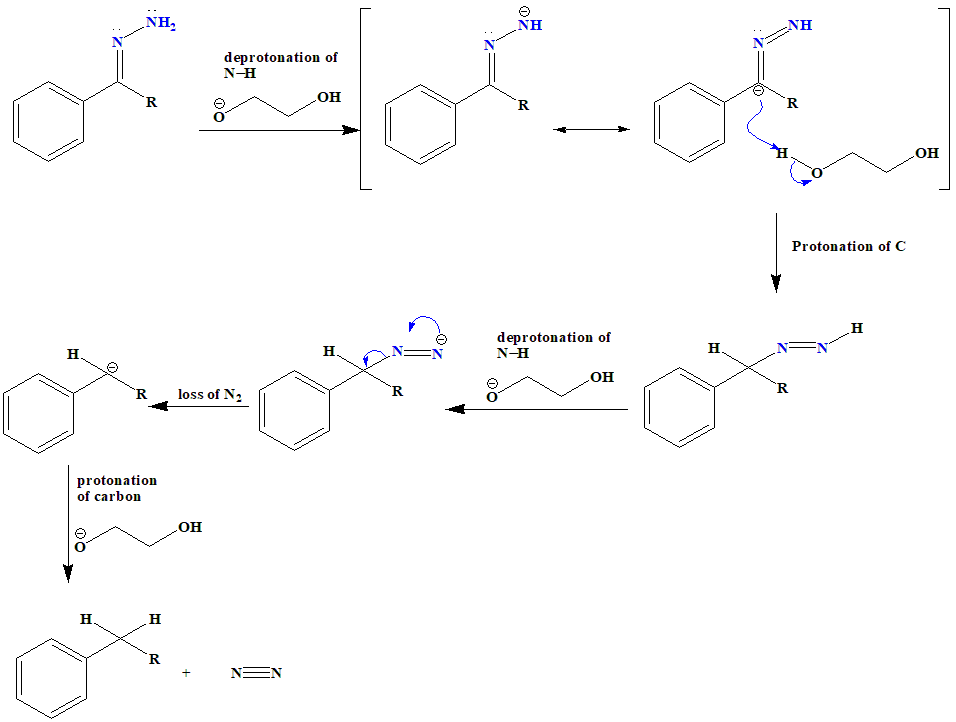 The \(NH_2\) of the hydrazone is reasonably acidic (\(pK_a\) about \(21\)) and can be deprotonated by strong base at a high enough temperature (the base is likely the conjugate base of ethylene glycol, not \(KOH\)). This deprotonation appears to be the rate-limiting step. The next step is the trickiest: protonation on the carbon. With the caveat that resonance forms don’t really exist, it can be helpful to imagine forming the resonance form of this species that has a negative charge on the carbon, and then protonating it with solvent (ethylene glycol). This gives a species with a nitrogen-nitrogen double bond, which, after deprotonation by base, decomposes irreversibly to give nitrogen gas and a carbanion (i.e. a negatively charged carbon). Protonation of the carbon completes the process.