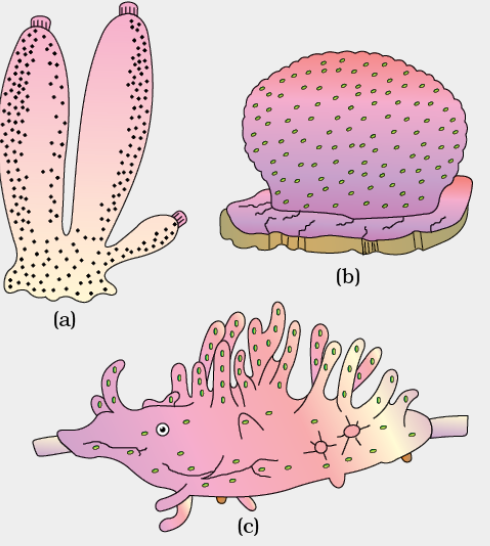 The correct answer is Option (1) -Choanocytes Members of phylum porifera are commonly known as sponges. They are generally marine and mostly asymmetrical animals.These are primitive multicellular animals and have cellular level of organisation. Sponges have a water transport or canal system. Water enters through minute pores (ostia) in the body wall into a central cavity, spongocoel, from where it goes out through the osculum. This pathway of water transport is helpful in food gathering, respiratory exchange and removal of waste. Choanocytes or collar cells line the spongocoel and the canals. Digestion is intracellular. The body is supported by a skeleton made up of spicules or spongin fibres. Sexes are not separate (hermaphrodite), i.e., eggs and sperms are produced by the same individual. Sponges reproduce asexually by fragmentation and sexually by formation of gametes. Fertilisation is internal and development is indirect having a larval stage which is morphologically distinct from the adult. Examples of Porifera : (a) Sycon (b) Euspongia (c) Spongilla |