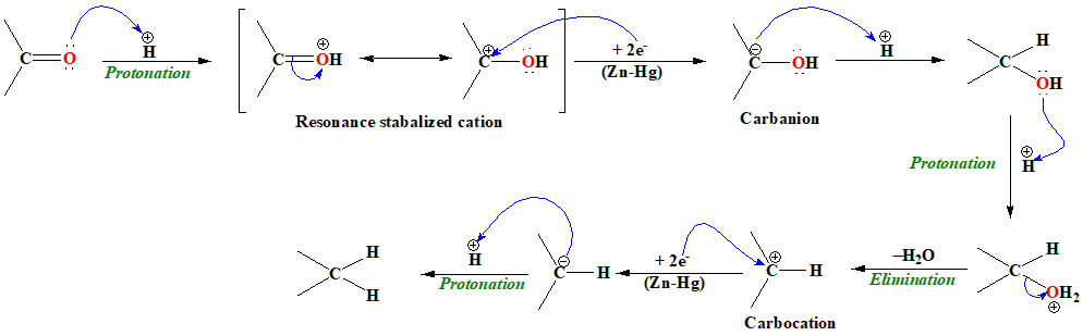 Mechanism of the Clemmensen Reduction In this reaction mineral acid supplies proton to oxygen, whereas metal \(Zn\) supplies an electron pair to the electron deficient carbonyl carbon to form carbanion. This mechanism involves three steps namely (i) formation of carbanion, (ii) elimination of water and (iii) addition of proton