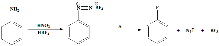 Thus, the reaction given in the question is correct. D. Balz-Schiemann Reaction: Balz Schiemann Reaction deals with the preparation and subsequent thermal decomposition of an aromatic fluoborate to give the corresponding aryl fluoride. The reaction gets its name from the German scientists – Günther Schiemann and Günther Balz. The basic reactants are aromatic amines, nitrous acid, and fluoroboric acid. Aromatic amines undergo diazotization under the influence of nitrous acid. Fluoroboric acid is now added to give rise to the corresponding aryl diazonium salt. Now, this aryl diazonium salt is subjected to heat to undergo thermal decomposition and give the aryl fluoride along with Nitrogen and Boron trifluoride.