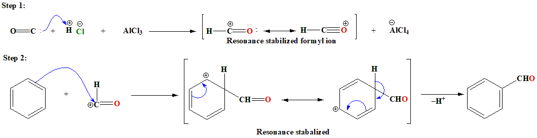 Mechanism: Gattermann-Koch synthesis is believed to involve electrophilic substitution of the aromatic substrate, the electrophile being the formyl cation.