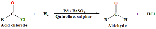 Thus, the reaction given in the question is correct. B. Rosenmund reduction Reduction of acid chloride by hydrogenation in the presence of palladium poisoned by barium sulfate gives aldehyde. This is called the Rosenmund reaction. The catalyst is made by reducing a solution of palladium (II) chloride in the presence of barium sulfate. This method cannot produce formaldehyde because formyl chloride is unstable at ambient temperature. Rosenmund reduction is used in the production of saturated fatty aldehyde.
