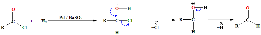 Mechanism: When hydrogen gas is passed through the acyl chloride in the presence of a rosenmund catalyst, aldehyde, and hydrochloric acid are formed. In this reaction, barium sulfate reduces the activity of palladium and prevents over-reduction.