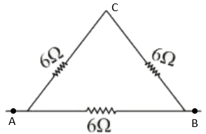 The correct answer is Option (4) → 4 Ω When wire is bent into an equitorial angle, and the total resistance of the wire is 18 Ω. $R_{side}=\frac{18 Ω}{3}=6Ω$ $R_{A→B→C}=6+6=12Ω$ $∴\frac{1}{R_{AB}}=\frac{1}{12}+\frac{1}{6}=\frac{3}{12}$ $\frac{1}{R_{AB}}=4Ω$ |