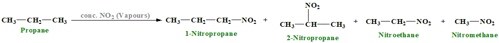 The correct answer is option 3. 1-nitropropane + 2-nitropropane + nitroethane + nitromethane. Vapour phase nitration of propane is a reaction that involves the introduction of a nitro group (-NO2) to the propane molecule in the gas phase, typically using nitric acid or nitrogen dioxide at high temperatures. This reaction can yield a mixture of products because different carbon atoms in propane can be nitrated. Propane (\(C_3H_8\)) has the following structure: \(H_3C-CH_2-CH_3 \) When propane undergoes nitration in the vapor phase, it primarily yields 1-nitropropane and 2-nitropropane as the main products. Additionally, at high temperatures, the reaction can also lead to further fragmentation and formation of smaller nitro compounds such as nitroethane and nitromethane. Possible Products: 1-nitropropane (\(CH_3CH_2CH_2NO_2\)): Nitration occurs at the primary carbon (first carbon). 2-nitropropane (\(CH_3CH(NO_2)CH_3\)): Nitration occurs at the secondary carbon (second carbon). Nitroethane (\(CH_3CH_2NO_2\)): Formed by fragmentation of the propane chain. Nitromethane (\(CH_3NO_2\)): Formed by further fragmentation.