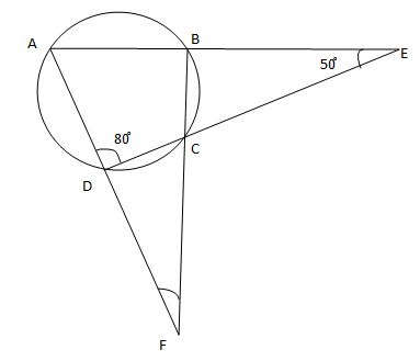ABCD is a cyclic quadrilateral such that when sides AB and DC are produced, they meet at E, and sides AD and BC meet at F, when produced. If ∠ADE = 80° and ∠AED = 50°, then what is the measure of ∠AFB ? |