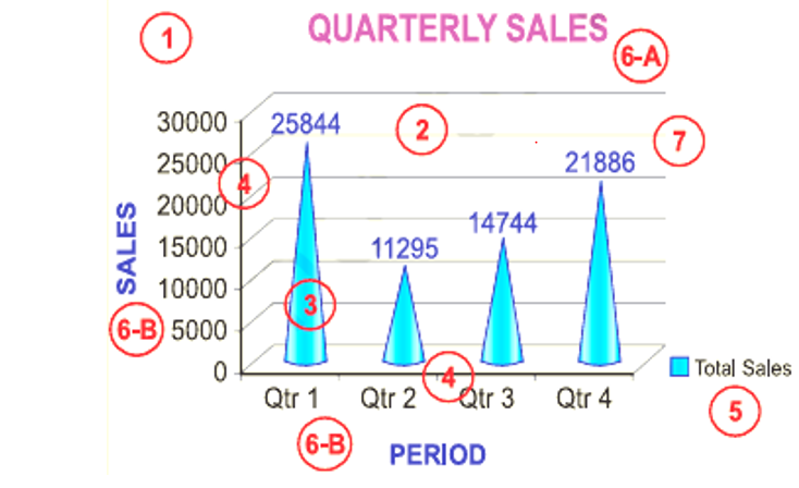 The correct answer is option 3- The horizontal (category) and vertical (value) axis. The horizontal (category) and vertical (value) axis is depicted at number 4 in the given figure. The horizontal (category) and vertical (value) axis: The x-axis is usually the horizontal line which contains categories (independent values or categories) and y-axis is usually the verticals which contains data (dependent values).