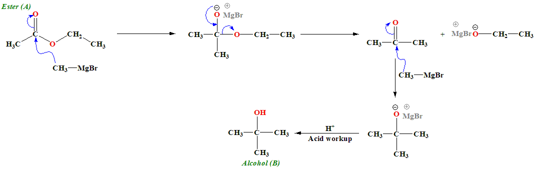 Molecular Formula: \(C_4H_{10}O\) The possible structure for alcohol \(B\) is tert-butyl alcohol, \((CH_3)_3COH\). tert-Butyl alcohol is a tertiary alcohol and is known to react fastest with Lucas reagent due to the formation of a stable carbocation during the reaction. Since the product is \(C_4H_{10}O\) (tert-butyl alcohol), the ester must be such that when it reacts with 2 equivalents of \(CH_3MgBr\), it produces tert-butyl alcohol. For this to happen, the ester must be ethyl acetate \(CH_3COOC_2H_5\). Reaction: