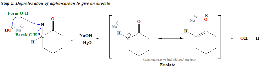 Mechanism: When considering what a mechanism might look like, the first thing to note is that we are using a strong base, NaOH. This raises a question about the most acidic proton here. [Hint: it’s not the C-H attached to the aldehyde, as that would result in an acyl anion, which is not resonance-stabilized.]