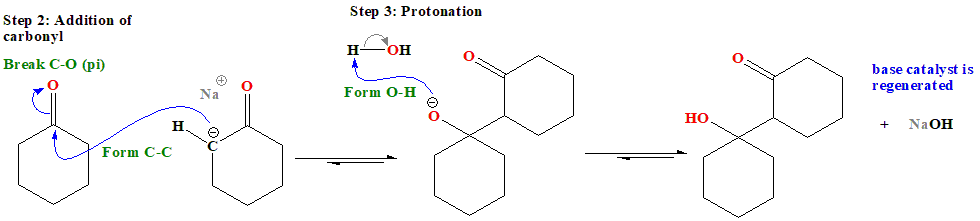 Therefore, a necessary requirement for the aldol reaction is that the aldehyde be enolizable (i.e. have a proton on the alpha carbon). No proton → no enolate → no aldol. The key to the reaction is that the enolate, once formed, is an excellent nucleophile and can rapidly react with any available electrophiles hanging around in solution – such as, for example, aldehydes. The product requires that we form C–C and break C–O (pi). The enolate thus adds to the aldehyde in Step 2 (form C–C, break C–O (pi) ), an example of the most classic mechanistic step of carbonyls, addition. In this way, all starting aldehyde is eventually converted to the aldol addition product, despite the unfavorable acid-base equilibrium. After the addition reaction, the resulting negative charge on oxygen then undergoes protonation by the solvent (Step 3, form O–H).