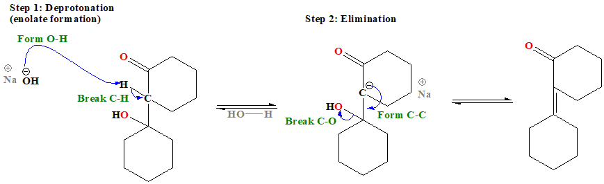 If the resulting aldol addition product (the beta-hydroxy aldehyde) is heated with base, it can lose water to give a new C-C pi bond. This is referred to as an aldol condensation reaction since water is formed as a byproduct. For our purposes the most important distinguishing factor is “HEAT“, which tends to favor elimination reactions. The elimination step works like this and is an example of an \(E_{1_{CB}}\) reaction.