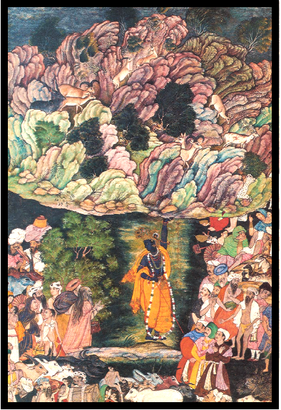 The painting shown is Krishna Lifts Mount Govardhan from a dispersed Harivamsa Purana is attributed to Miskin. This picture was made under the protection of Akbar. Krishna Lifts Mount Govardhan from a dispersed Harivamsa Purana is attributed to Miskin (1585–90). It is in the collection of the Metropolitan Museum of Art, New York, USA. Harivamsa Purana is one of the many Sanskrit manuscripts, which were translated into Persian by the Mughals. This painting is on a theme from Harivamsa. Badauni, a scholar noble in the court of Akbar, was assigned the job of translating this volume on Lord Krishna into Persian. Hari or Lord Krishna lifted the mountain, Govardhan, with all creatures dwelling therein with the intention to protect them — the villagers and their livestock, who were his followers, from torrential rain sent by another powerful God Indra. Hari uses the mountain like a huge umbrella, under which the entire village takes refuge. |