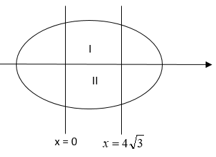 The correct answer is Option (3) - $8 \sqrt{3}+\frac{32 \pi}{3}$ units $x=8 \cos t$, $y=4 \sin t$ $\frac{x}{2}=4\cos t$, $y=4\sin t$ so $\frac{x^2}{4}+y^2=4^2(\cos^2t+\sin^2t)$ $⇒\frac{x^2}{2^2}+\frac{y^2}{12}=4^2$ or $\frac{x^2}{8^2}+\frac{y^2}{4^2}=1$, $y=\frac{1}{2}\sqrt{8^2-x^2}$ area I = area II by symmetry so area = $2×\int\limits_0^{4\sqrt{3}}\frac{1}{2}\sqrt{8^2-x^2}dx$ $=\int\limits_0^{4\sqrt{3}}\sqrt{8^2-x^2}dx$ $=\left[\frac{x}{2}\sqrt{8^2-x^2}+\frac{8^2}{2}\sin^{-1}\frac{x}{8}\right]_0^{4\sqrt{3}}$ $=8\sqrt{3}+\frac{32 \pi}{3}$ |