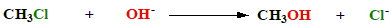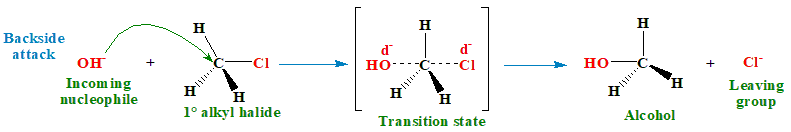 The rate of the reaction is expressed as: Rate = k[CH3Cl][OH–] In fact, methyl or primary alkyl halides follow this type of mechanism and it may, in general, be written as Rate = k[RX] [OH–] This reaction is also called nucleophilic substitution bimolecularbecause two molecules take part in determining the rate of the reaction. It is written as SN2, short form for substitution nucleophilic bimolecular. This type of reaction occurs in single (concerted) step through the formation of a transition state. In this mechanism, the nucleophile, OH– attacks the partially positively charged carbon atom of carbon halogen bond from the direction 180° away from the halogen atom i.e., from the backside. This leads to a transition state with a partially formed C—OH bond and a partially broken C—Cl bond. This process is a one-step reaction. In the transition state, the negative charge is shared by both the incoming nucleophile as well as outgoing chloride. Hydroxide has a diminished negative charge because it has begun to share its electrons with carbon while chlorine has developed a partial negative charge because it has partly removed a pair of electrons from carbon. Therefore, both OH and Br have a partial negative charge i.e., δ–. The remaining three bonds to carbon in the transition state adopt a planar arrangement. This arrangement may be described as the C—H bonds being arranged like the spokes of a wheel with C—OH and C—Br bonds lying along the axle.
