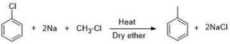The correct answer is Option (3) → Wurtz Fittig reaction The reaction of chlorobenzene and methyl chloride with sodium in dry ether is an example of the Wurtz-Fittig reaction. Reaction Details In this process, an aryl halide (chlorobenzene) and an alkyl halide (methyl chloride) are treated with sodium metal in the presence of dry ether to yield an alkyl-substituted aromatic compound (toluene). $C_6H_5Cl + CH_3Cl + 2Na \overset{\text{dry ether}}{\longrightarrow} C_6H_5CH_3 (\text{Toluene}) + 2NaCl$ Comparison of Related Reactions It is easy to confuse these similar coupling reactions, but they differ based on the starting materials used: