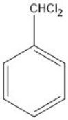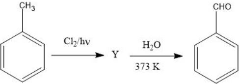 The correct answer is Option (2) → The intermediate $Y$ is benzal chloride ($C_6H_5-CHCl_2$). Complete statement: In the commercial manufacture of benzaldehyde from toluene, the intermediate formed is benzal chloride ($C_6H_5-CHCl_2$). Reasoning: 1. The starting compound is toluene ($C_6H_5-CH_3$). 2. Treatment with $Cl_2 / hv$ (sunlight) causes free-radical side-chain chlorination, not ring chlorination. 3. The methyl group is successively chlorinated: $C_6H_5-CH_3 → C_6H_5-CH_2Cl → C_6H_5-CHCl_2$ (benzal chloride) 4. On hydrolysis with hot water at 373 K, benzal chloride is converted into benzaldehyde ($C_6H_5-CHO$). Therefore, the correct intermediate Y is: $C_6H_5-CHCl_2$ (benzal chloride) |