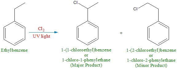 The main product formed when ethyl benzene reacts with chlorine in the presence of UV light is |