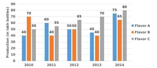 Production of flavour A in 2013 = 45 Production of flavour A in 2011 = 60 Percentage decline in production of A in 2013 as compared to 2011 = \(\frac{60-45}{60}\) × 100 = \(\frac{15 }{60}\) × 100 = 25% |