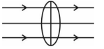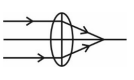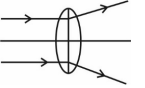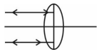 The correct answer is option (4) : From lens marker's formula $\frac{1}{f}=\left(\frac{\mu_f}{\mu_g}-1\right)\left(\frac{1}{R_1}-\frac{1}{R_2}\right)$ If $\mu_f= \mu_g$, then $\frac{1}{f}=0$ $⇒f=∞$ Hence ray diagram will be |