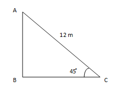 ⇒ cos \({45}^\circ\) = \(\frac{BC}{12}\) ⇒ \(\frac{1}{√2}\) = \(\frac{BC}{12}\) ⇒ BC = \(\frac{12}{√2}\) = 6\(\sqrt {2 }\)m. Therefore, the distance between the wall and the foot of the ladder is 6\(\sqrt {2 }\)m. |