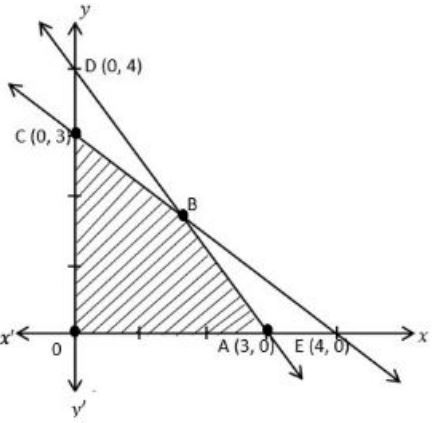 The correct answer is Option (1) → $4x + 3y ≤ 12, 3x+4y ≤ 12, x≥0,y≥0$ From the figure: Axes give: $x\ge 0,\; y\ge 0$ Line CE through (0,3) and (4,0): $3x+4y\le 12$ Line DA through (0,4) and (3,0): $4x+3y\le 12$ The feasible region OABCO is given by: $x\ge 0,\; y\ge 0,\; 3x+4y\le 12,\; 4x+3y\le 12$ |