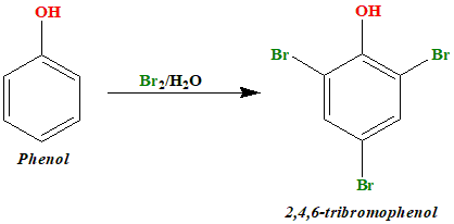 (a) C6H5—OH + Br2/H2O →(i) 2,4,6-tribromophenol: The reaction of phenol with bromine is known as bromination of phenol. Solvent has great influence on the reaction. In different solvents, different products are obtained. Phenol reacts with bromine water to give 2,4,6-tribromophenol. In water, ionization is facilitated. Phenol gets ionized to form phenoxide ion, which is even better ortho, para-directing. Bromine also gets ionized to a larger extent to form a large number of bromonium ions. And Bromine ions are highly stabilized in ionic solvents. So the formation of strong o, p-directing group and stabilization of \(Br^+\) enhances the formation of tribromophenol.