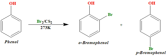 (b) C6H5—OH + Br2/CS2 →(iv) p-bromophenol and o-bromophenol: The reaction of phenol with bromine is known as bromination of phenol. Solvent has great influence on the reaction. In different solvents, different products are obtained. Phenol reacts with bromine in a presence of Carbon disulphide to form a mixture of o-bromophenol and p-bromophenol.