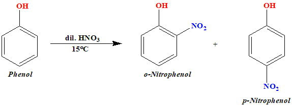 Phenol reacts with bromine in a presence of Carbon disulphide to form a mixture of o-bromophenol and p-bromophenol. Among which p-bromophenol is major. In \(CS_2\) ionisation is not facilitated that much. As it is a non-polar solvent it doesn't the \(Br^+\) on. Also \(−OH\) group is moderately o, p-directing. So as usual para-product is more formed. (c) C6H5—OH + dil. HNO3(15oC) →(ii) p-nitrophenol and o-nitrophenol: When phenol (C₆H₅OH) reacts with dilute nitric acid (HNO₃) at low temperature \((15^oC)\), it undergoes nitration, resulting in a mixture of ortho-nitrophenol (2-nitrophenol) and para-nitrophenol (4-nitrophenol).