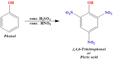 This reaction typically results in the formation of a mixture of ortho and para isomers, with the para isomer generally being the major product due to steric reasons. However, the exact ratio of ortho to para products can depend on various factors such as the concentration of nitric acid, temperature, and reaction time. (d) C6H5—OH + conc. H2SO4/conc. HNO3 →(iii) 2,4,6-trinitrophenol: Phenol first reacts with concentrated sulphuric acid which converts it to phenol-2,4-disulphonic acid and then with concentrated nitric acid to get 2,4,6-Trinitrophenol. It is because \(-OH\) is a strong activating group towards electrophilic substitution. So it forms 2,4,6-Trinitrophenol instead of ortho or para nitro phenols.