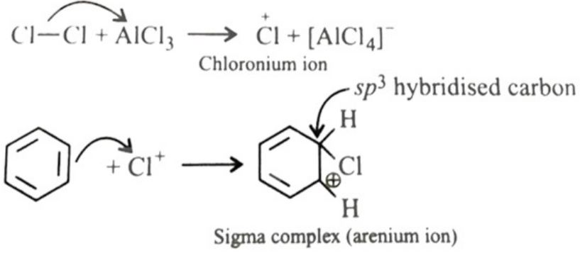 The correct answer is Option (2) → $Cl^+$ Chlorination of benzene occurs through an electrophilic aromatic substitution reaction. In the presence of AlCl₃ (Lewis acid catalyst), chlorine molecules become polarized and generate the electrophile required for substitution. Step 1: Formation of electrophile Cl₂ + AlCl₃ → Cl⁺ + AlCl₄⁻ Here Cl⁺ (chloronium ion) acts as the electrophile that attacks the benzene ring. Step 2: Electrophilic attack The benzene ring donates electrons to Cl⁺, forming a sigma complex (arenium ion). Step 3: Restoration of aromaticity A proton is removed from the ring by AlCl₄⁻, forming chlorobenzene and regenerating AlCl₃. Thus, the species involved as the active electrophile in chlorination of benzene is Cl⁺. Option A Incorrect. Cl⁻ (chloride ion) is a nucleophile, not an electrophile. Electrophilic aromatic substitution requires a positively charged electrophile, so Cl⁻ cannot attack benzene. Option B Correct. -- Cl⁺ (chloronium ion) is generated when chlorine reacts with AlCl₃. This positively charged species acts as the electrophile that attacks the benzene ring, initiating chlorination. Option C Incorrect. AlCl₄⁺ is not formed in this reaction. Instead, the reaction produces AlCl₄⁻, which later helps remove a proton to restore aromaticity. Option D Incorrect. AlCl₄⁻ is formed during the reaction, but it acts as a base that removes a proton from the sigma complex, not as the electrophile that attacks benzene. |