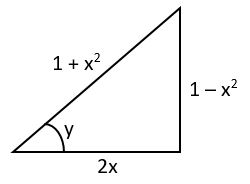 $y=\sin ^{-1}\left(\frac{1-x^2}{1+x^2}\right)$ Taking sin on both sides $\Rightarrow \sin y=\frac{1-x^2}{1+x^2}$ so third side by pythagoras theorem $=\sqrt{\left(1+x^2\right)^2-\left(1-x^2\right)^2}$ $=2 x$ differentiating sin y w.r.t x $\frac{d(\sin y)}{d x}=\frac{d}{dx}\left(\frac{1-x^2}{1+x^2}\right)$ $\cos y \frac{dy}{dx} = \frac{(1+x^2)\frac{d}{dx}(1-x^2)-(1-x^2)\frac{d}{dx}(1+x^2)}{(1+x^2)^2}$ $\Rightarrow \cos y \frac{d y}{d x} =\frac{\left(1+x^2\right)(-2 x)-\left(1-x^2\right)(2 x)}{\left(1+x^2\right)^2}$ $\cos y \frac{d y}{d x} =\frac{2 x\left(-1-x^2-1+x^2\right)}{\left(1+x^2\right)^2}$ $\cos y \frac{d y}{d x}=\frac{2 x(-2)}{\left(1+x^2\right)^2} \Rightarrow \frac{d y}{d x}= \frac{1}{\cos y} \frac{(-4 x)}{\left(1+x^2\right)^2}$ from pythagoras triangle $\Rightarrow \cos y=\frac{2 x}{1+x^2}$ so $\frac{d y}{d x}=\frac{\left(1+x^2\right)}{2 x} \frac{(-4 x)}{\left(1+x^2\right)^2}$ $\frac{d y}{d x}=-\frac{2}{1+x^2}$ |