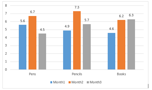 Pencils; Month 3 Pens; Month 1 Pencils; Month 2 Books; Month 3 |